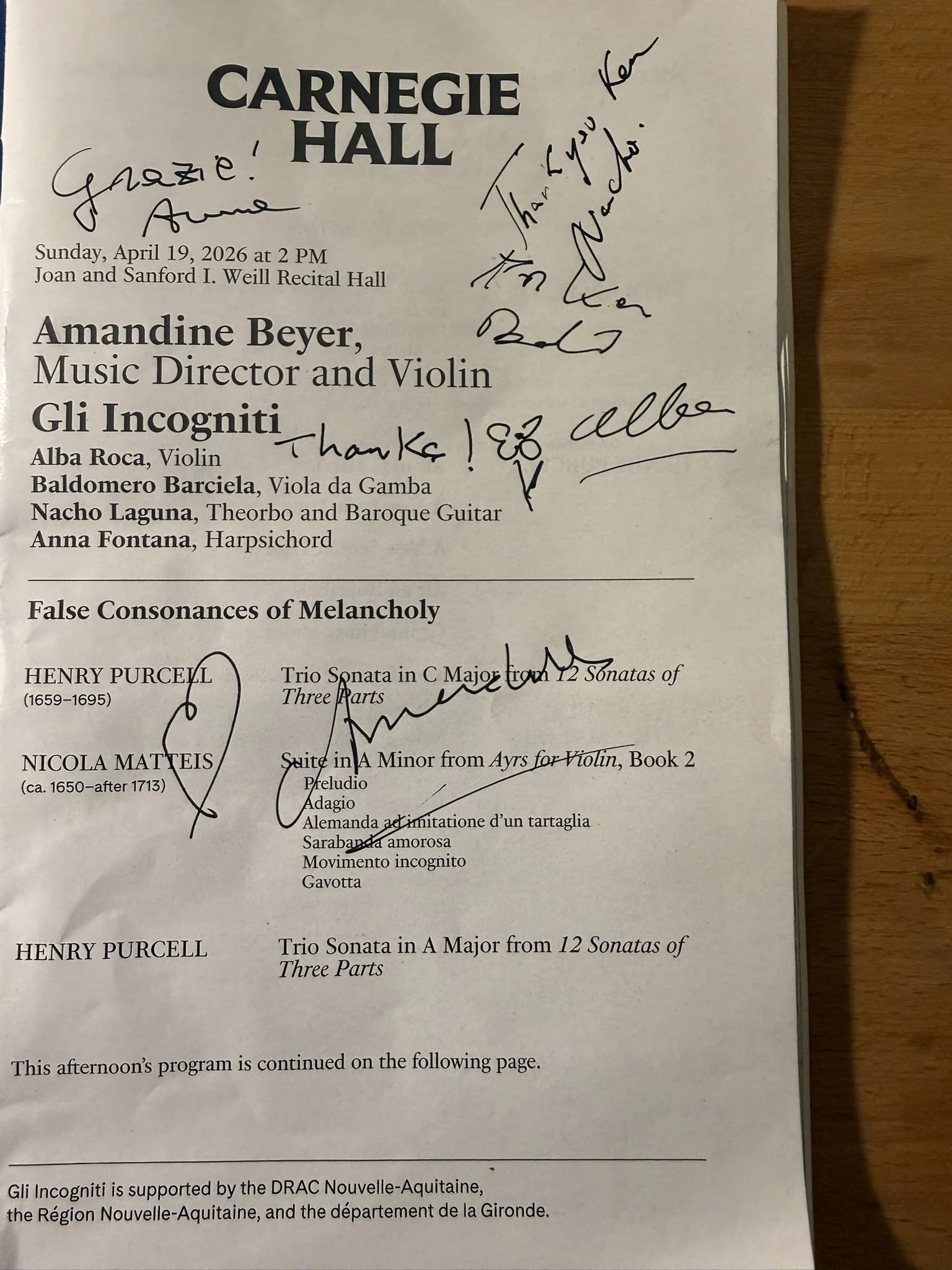 後半はどっちでもよくなった。これを見るとキーが全部単純。複雑なことをしていないが、描かれていた世界は、太陽の光が角度を変えて音色が自然に変わる。人が話すような場面もあったし、彼らが見て来た何かがそこを取りすぎるような感覚もした。前半はマッティスのエアーの2巻、後半は1巻。バッハを聴いているようだった。マッティスがどうやってフランス組曲のスタイルを覚えたか。アレマンドをどうやって覚えたか。学校でアレマンドはドイツ舞曲だと教えるが、チェンバロのアンナは当時はどこでも流行ってたと言っていた。マッティスはロンドンの家やパブで酒やたばこを飲むように音楽を吸収していったんだろうな。時々、もう一人のバイオリンのアルバがステージからいなくなって4人で合奏した。部分によってはガンバやギターとアマンディーヌのバイオリンが協奏した。アンナのチェンバロはそれをサポートしているはずなのにいつの間にか後ろなのに一番よく歌っていたりする。アマンディーヌのマッティスは、アルバがいないときは、1人で2人のバイオリニストが演奏しているようだった。目をつぶると2人いて、開くとアマンディーヌしかいない。マッティスのG 2巻。彼らも音の影に模様を描く天才だ。後半はマッティスの1巻のgで始まる。バッハだった。マッティスが腐ったロンドンで過激な音楽教科書を発売し始めたのは1676年。バッハが組曲を書いていたのはワイマール時代の1710年ごろ。マッティスがロンドンに持ち込んだスタイルがバッハに伝わったか、そこら中組曲だらけだったかはしらないが、アマンディーヌにとってマッティスはバッハのように音楽をするためにとても大切な人だ。いい音楽を描くためには、心を開いてみんなと仲良くではだめで、自分はどう思っているか追及しないと腐敗していく、そしてこのグループのような演奏にはならない。この方たちは4人だが、ボストンはいろいろ含めたら100人超える。それで超もめている。しかし、ウィーンでは、彼らの頑固さとタフなぶつかり合いがクリスタルのような名演が生まれる。絶え間ない共存が美しい文化を育むということだ。もしかしたら、マッティスの300年後にロンドンでセックスピストルズが出てきたのはマッティスのせいかもしれない。わからない。