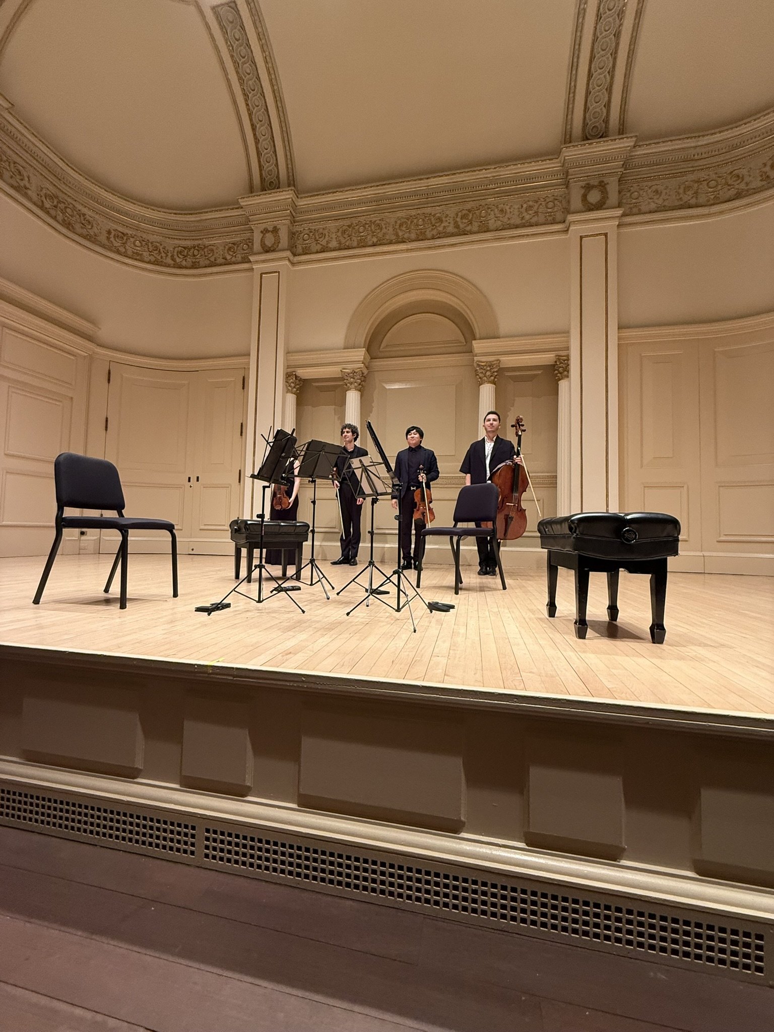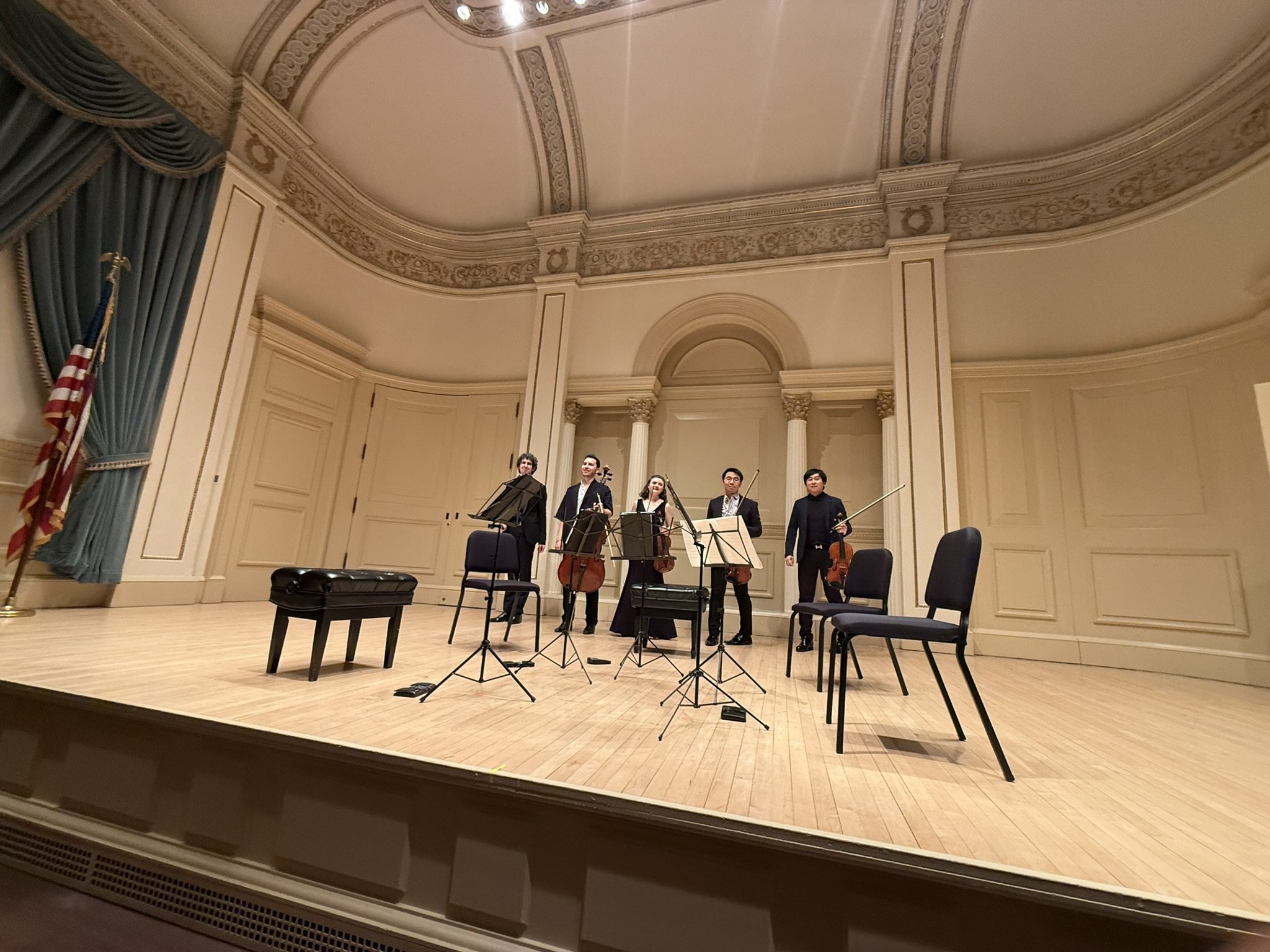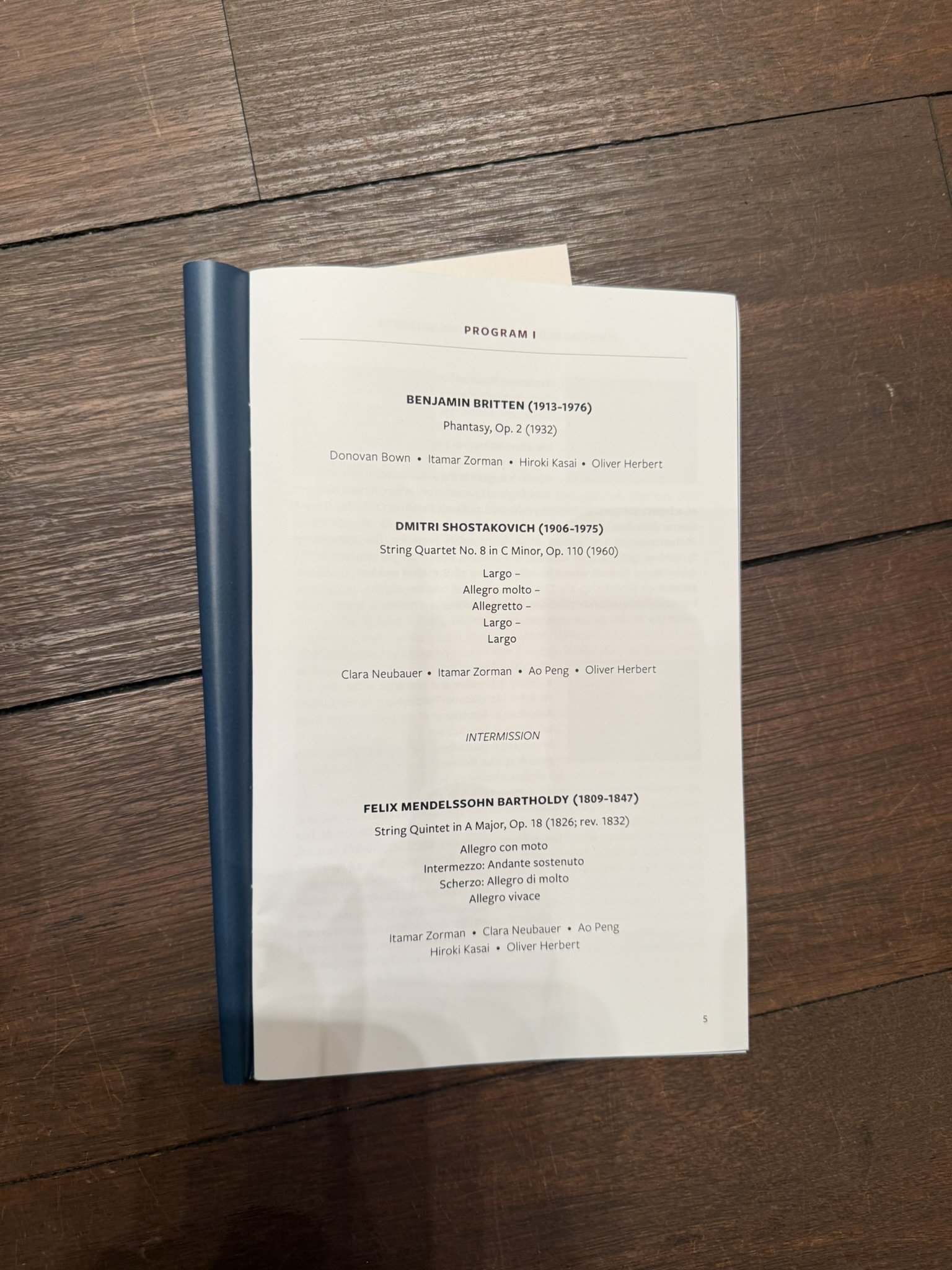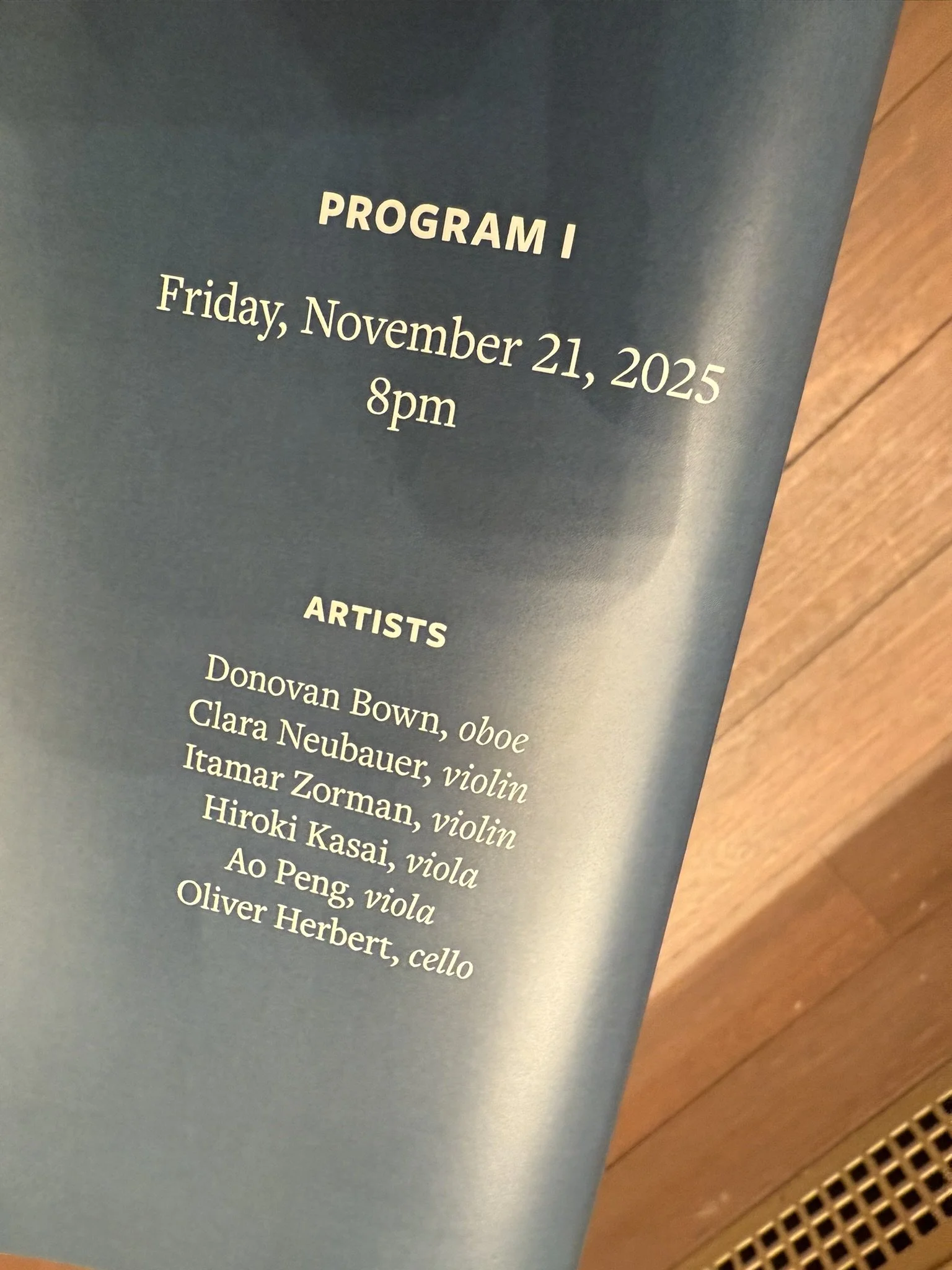 The Mendelssohn Quintet: 2 violins, 2 violas, and cello. Oliver's cello was excellent. His unique long notes. The way he grasped the keys—his tone. Ao Peng's viola was excellent. His ability to shape his phrases in space and blend them with the other parts was utterly different from the others. I felt his experience performing in an orchestra was different. Hiroki Kasai's viola was like a professional principal. He seemed the calmest of the members. It was like watching the movements and singing of the many viola parts we've experienced this season. Violinist Itamar Zorman's dynamics and lyrical intonations were completely unexpected in chamber music. When I asked if the dynamics were those specified by Mendelssohn, he said there were many fortes written in the sheets. This piece was like experiencing a symphony with a full orchestra. Clara Neubauer's tone was incredible. I caught a glimpse of the maestro's tone, sensing the violin's origins. The ensemble was immersed in every part, and in her own part, she blended with the others while still displaying a unique personality distinct from Itamar's. The most significant difference from the previous members in February was that they all possessed incredible personalities, yet formed a unified world.