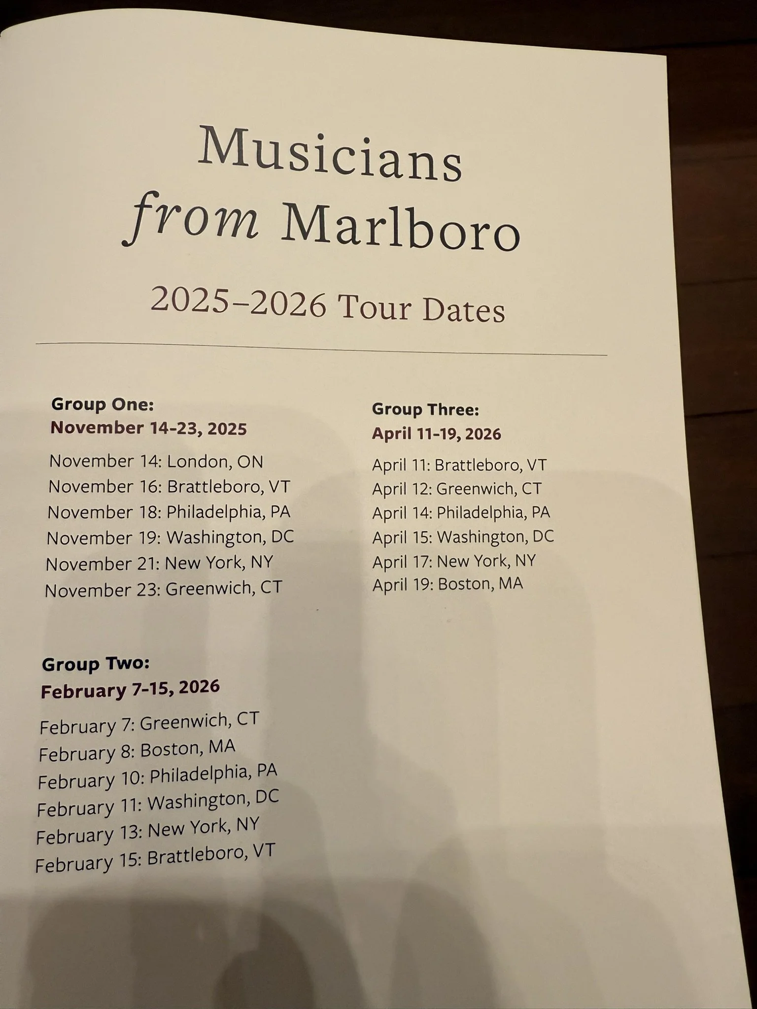 11.21.2025 Musicians From Marlboro at Weill Recital Hall. A chamber music group made up of young musicians associated with the Marlboro Music Festival in the United States. The festival, established in 1951, is known as a place where young and experienced musicians come together to study and perform chamber music. Selected members of the group give concerts both in the U.S. and abroad.