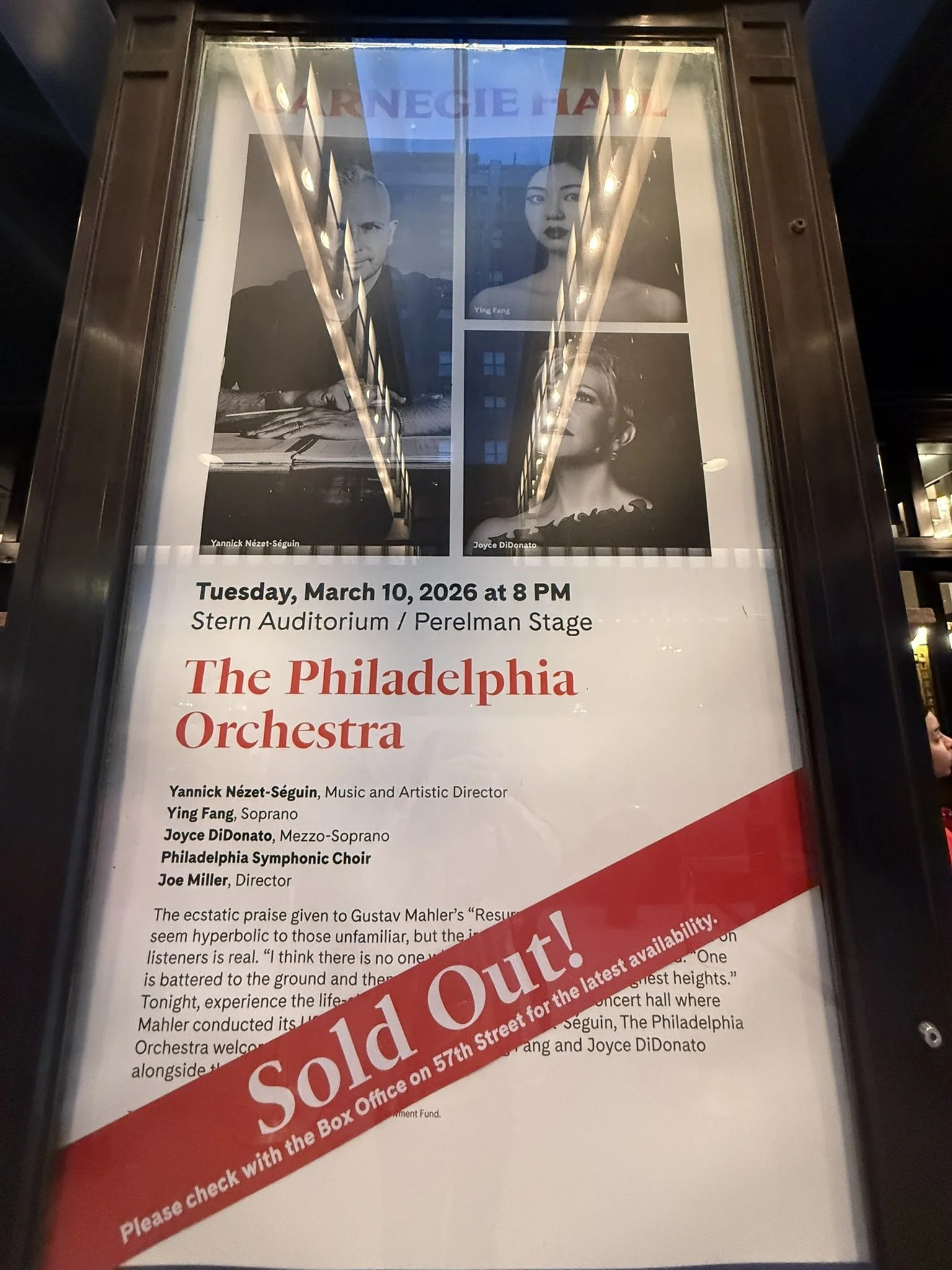 On March 10, 2026, at Carnegie Hall, I heard Yannick Nézet-Séguin and the Philadelphia Orchestra perform Mahler’s Symphony No. 2. The orchestra’s setup was enormous; the conductor’s podium extended beyond the stage, and the concertmaster David Kim’s right foot even hung off the edge. The opening featured high violins suspended in anxious tones, while cellos and double basses repeatedly played a theme reminiscent of Kaikobad from Strauss’s Die Frau ohne Schatten. A relentless succession of suffering. The rows of musicians each bore the weight of Mahler’s torment and projected it in a march of anguish. Then the brass introduced light, and the suffering violins briefly transformed into something beautiful, only to be drawn back into the darkness of Kaikobad. Kaikobad is like a toxic corporate world—pitch-dark and absurd, alternating with moments akin to watching the sunrise by a lake. Horns rang with crystal-clear brilliance, evoking memories of previous lives. Solos—from flutes to violins—appeared like shadows of my own path, only to be crushed again by the all-encompassing darkness. Absurd, cosmic, overwhelming blackness seemed to swallow everything, leaving me at a loss. Yet the powerful brass bursts and relentless timpani strikes resisted this darkness. Yannick’s Philadelphia Orchestra becomes a microcosm of society, extracted and channeled through Mahler, exploding in our hearts. That’s why even children are enthralled.